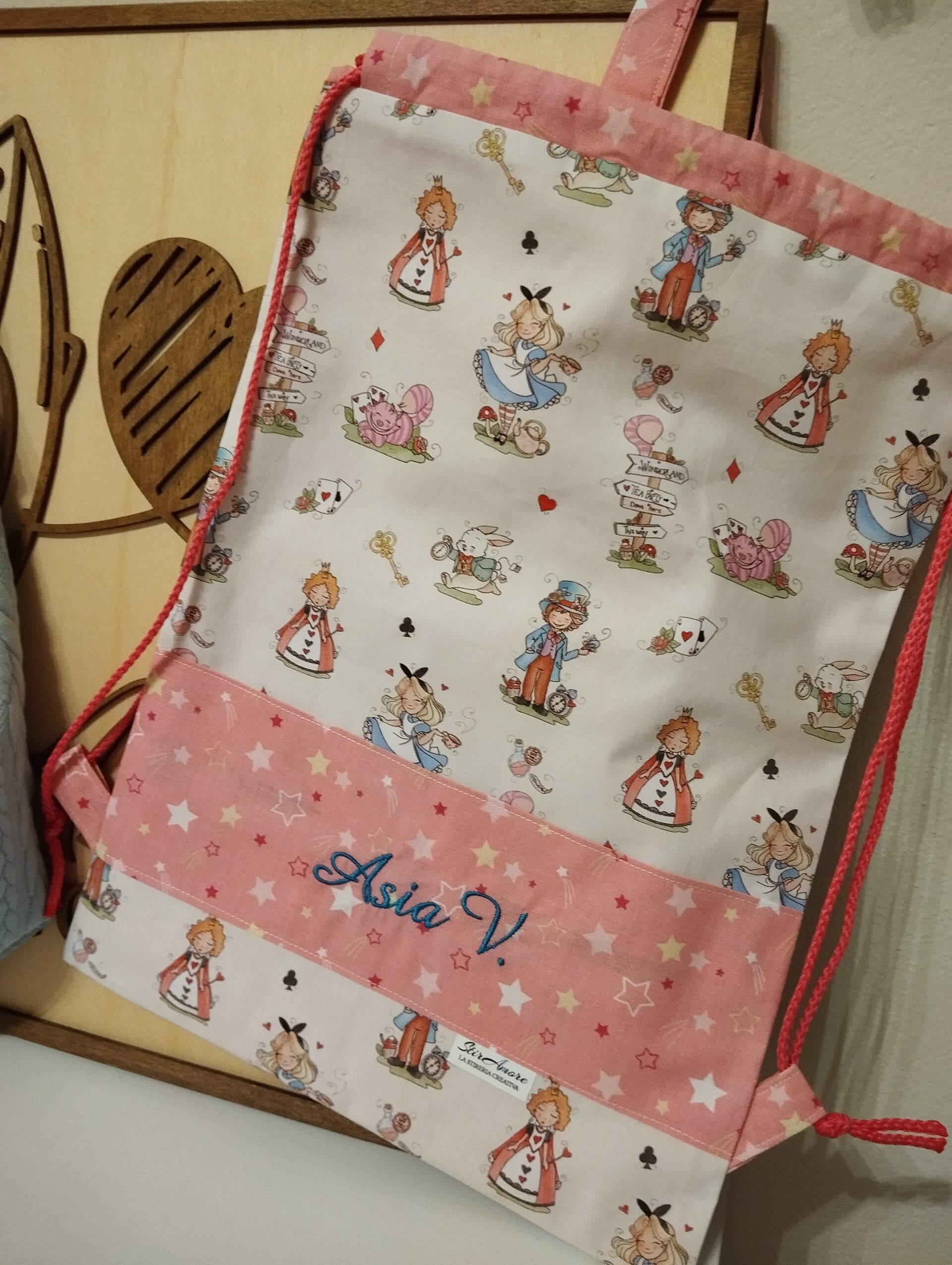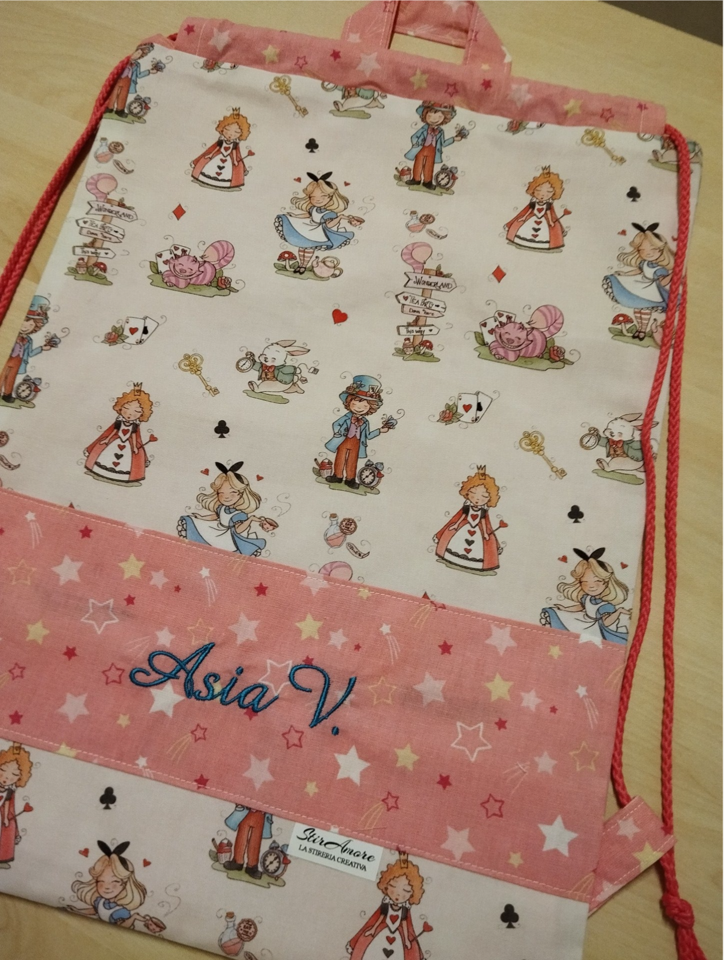 sacca zainetto 30x40 circa, con doppia chiusura con coulisse laterale ed asola per essere appesa